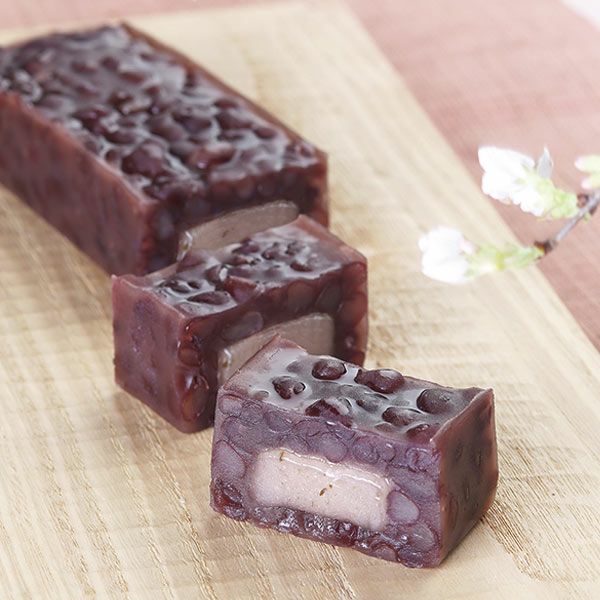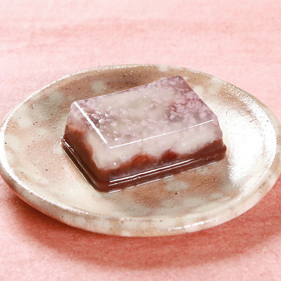 桜風味の小倉羊羹に求肥をのせ、道明寺羹で流し合わせました。