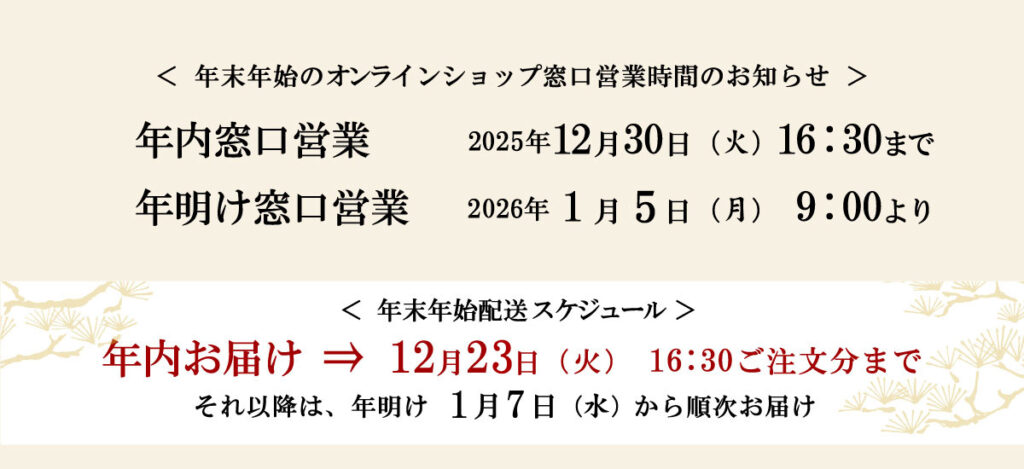 ※年始のお届け商品(1/1~1/5お届け分)につきましては、年内の製造となるため賞味期限が数日短くなります。いずれも12/31に出荷準備をいたします。